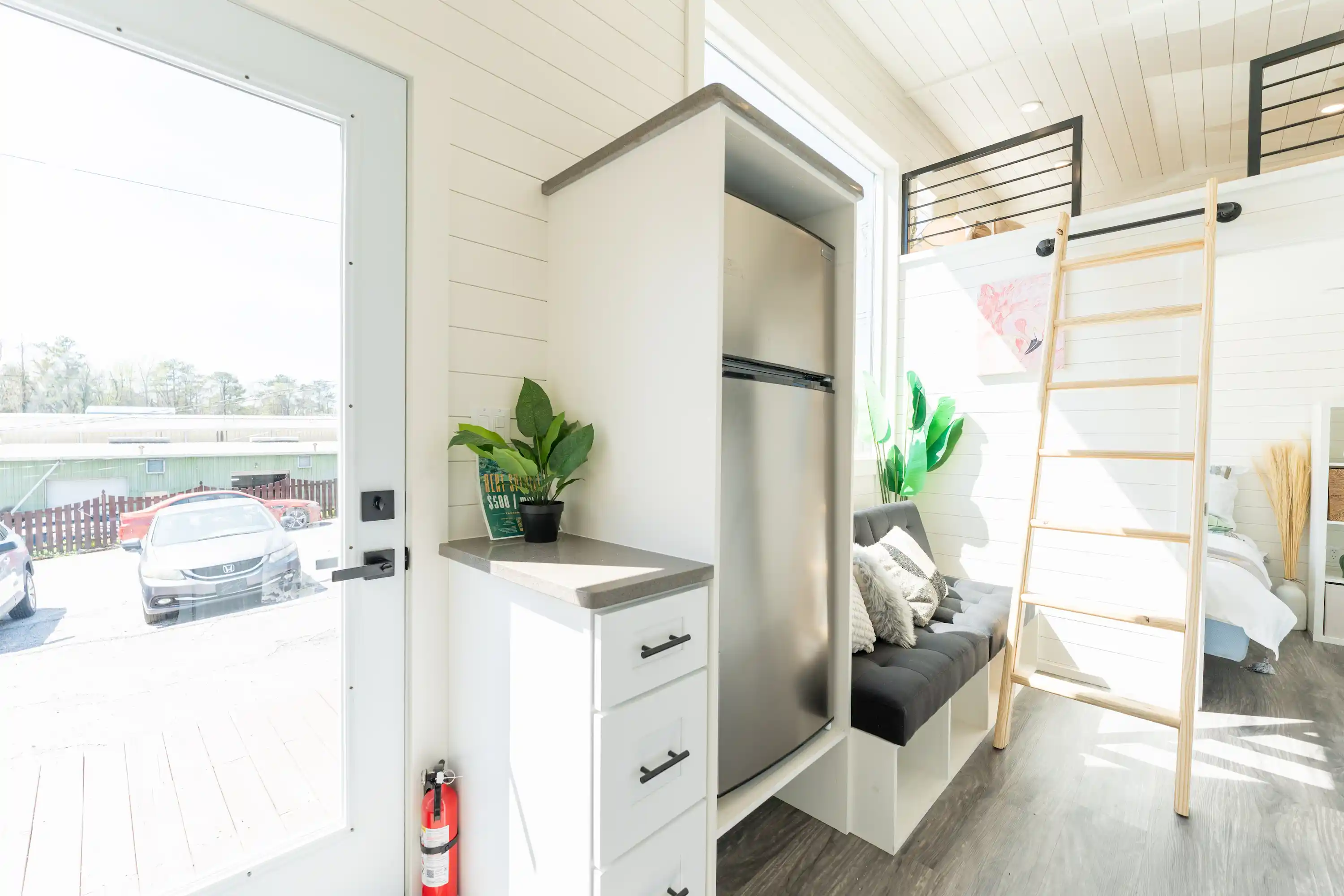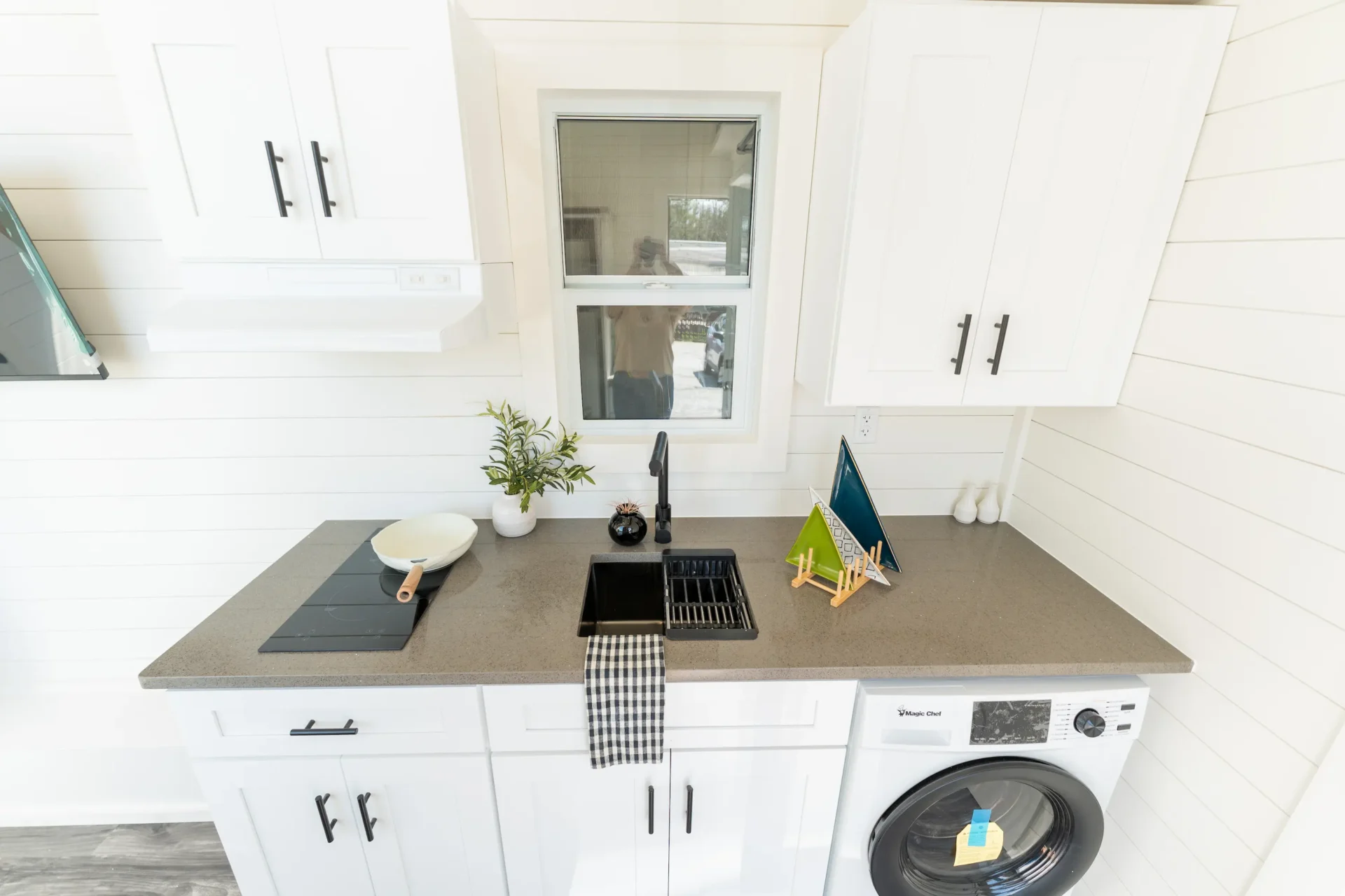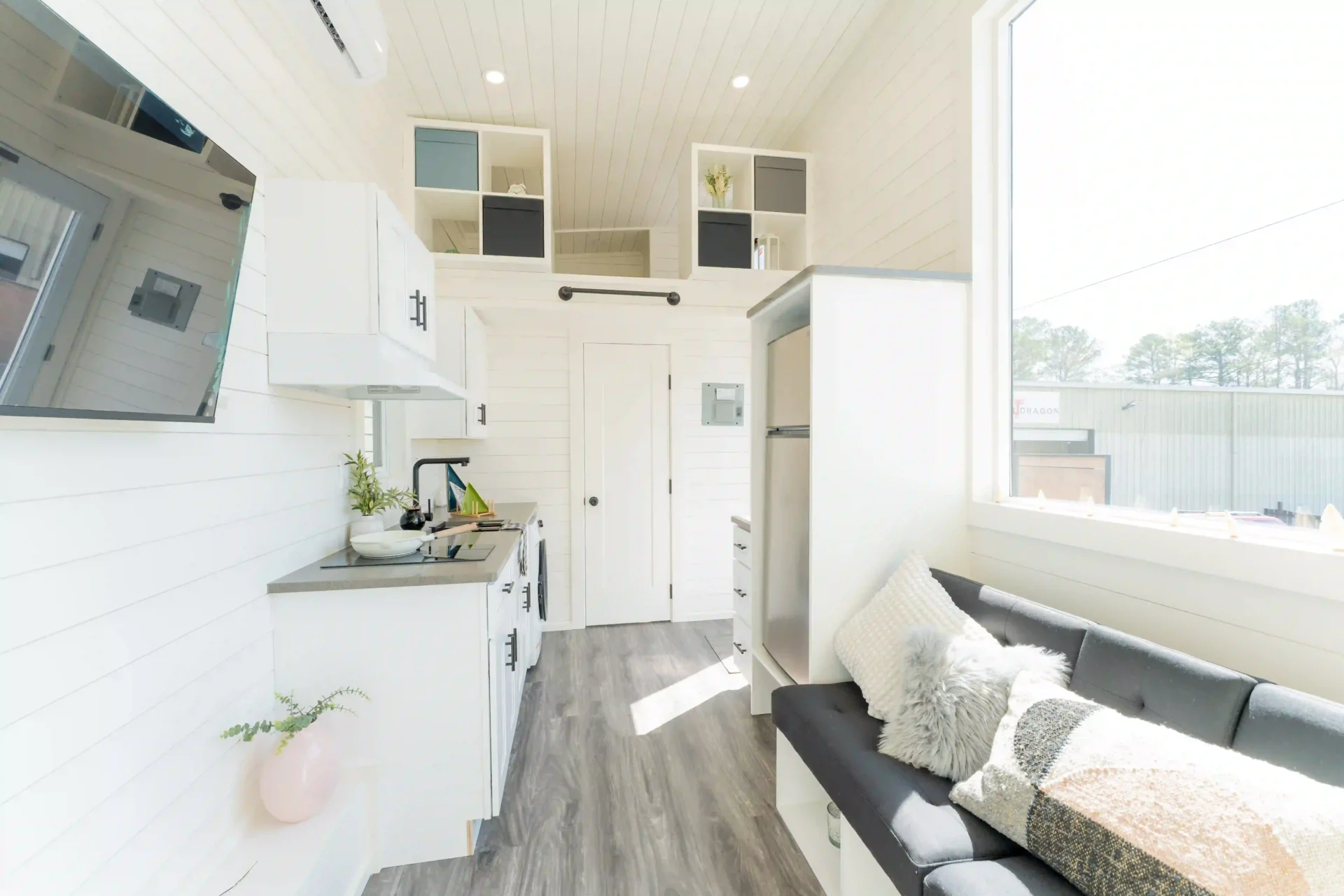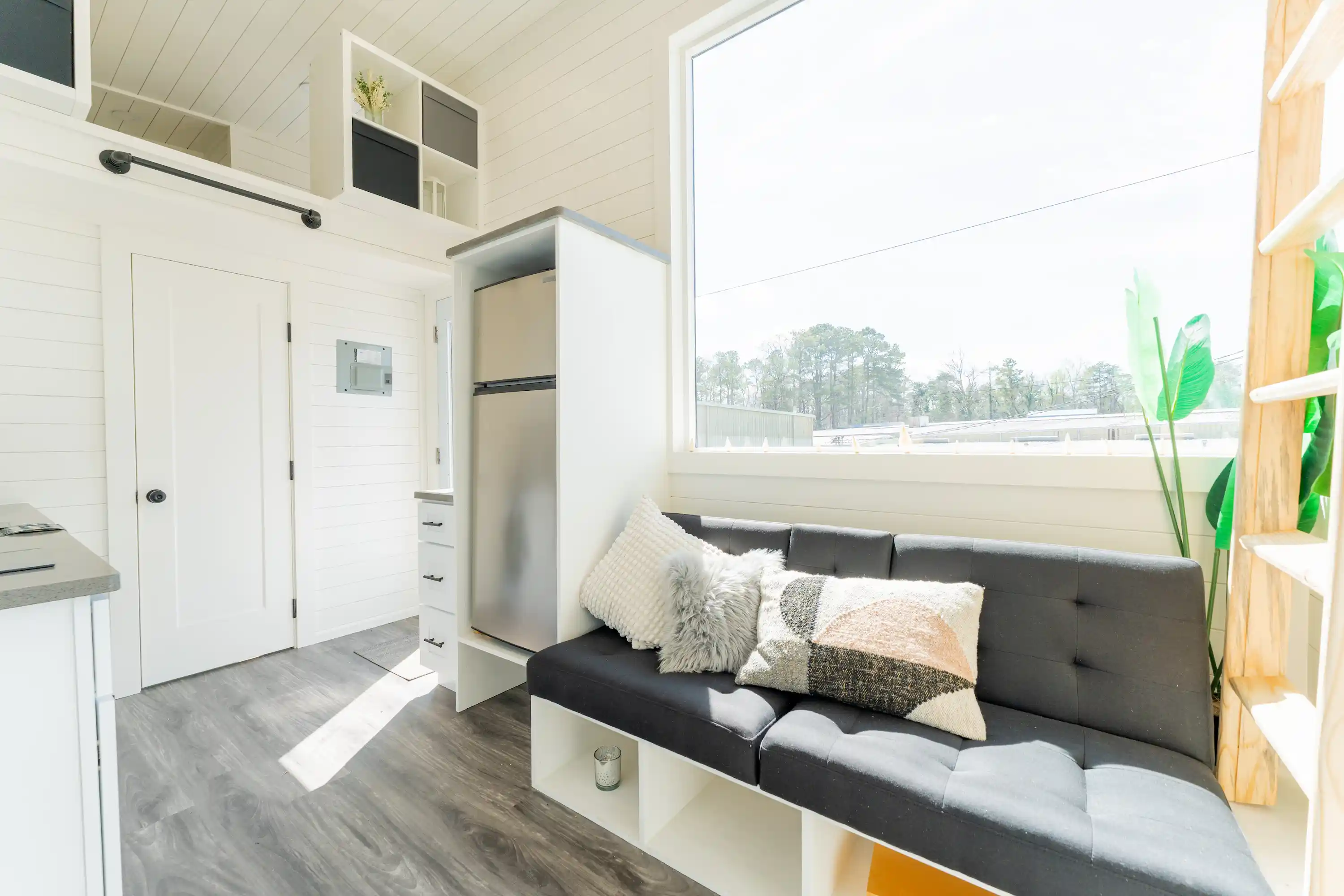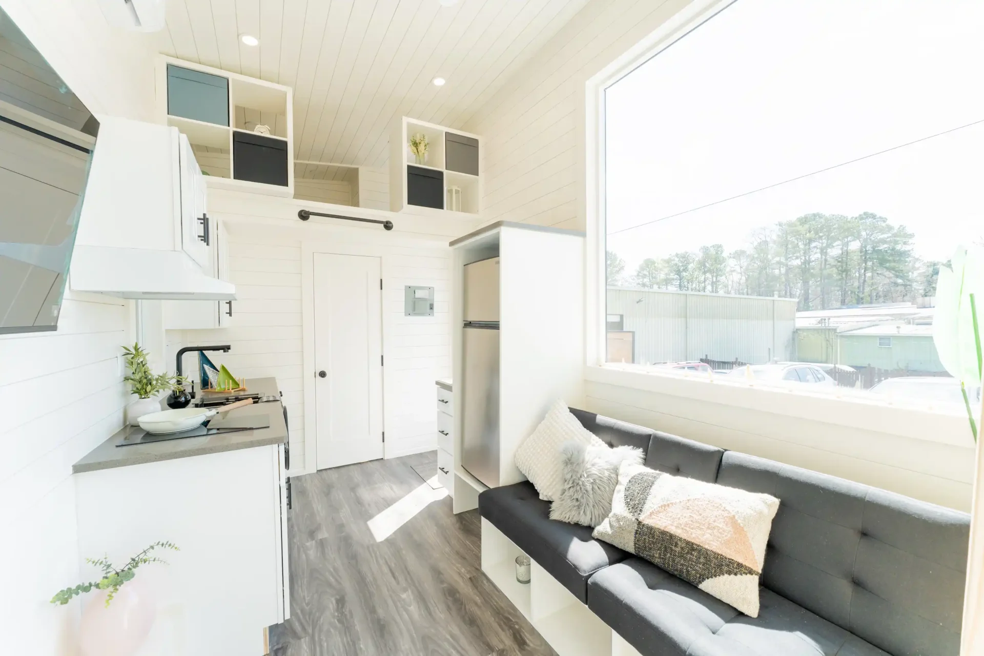 The layout is designed to feel open and bright, highlighted by a large 6′ x 6′ living room picture window that brings in natural light and makes the space feel much larger than a typical tiny home. Black windows throughout give the exterior and interior a clean, modern look.