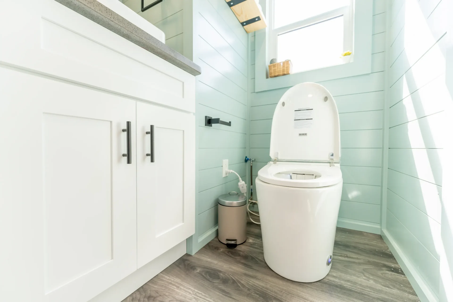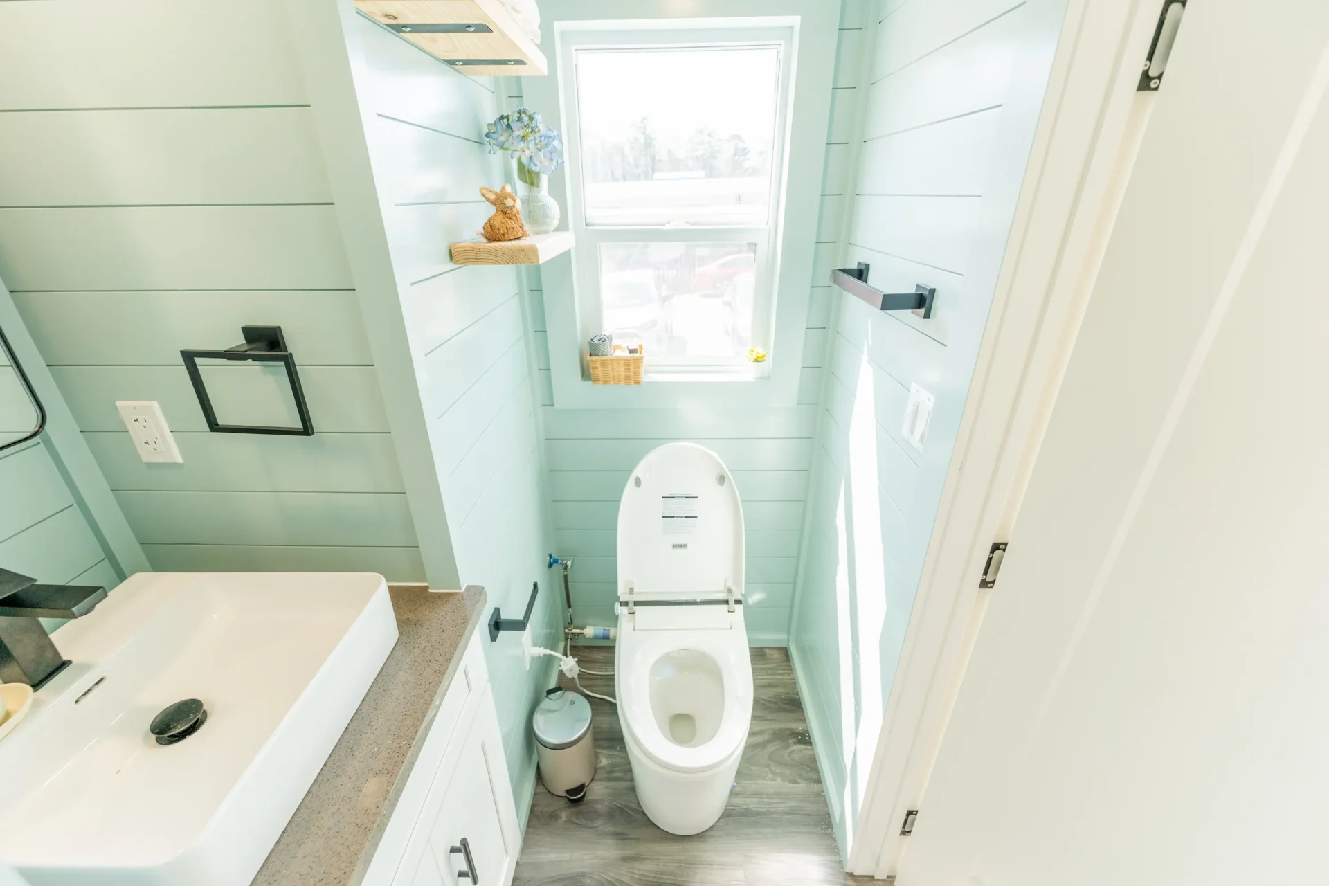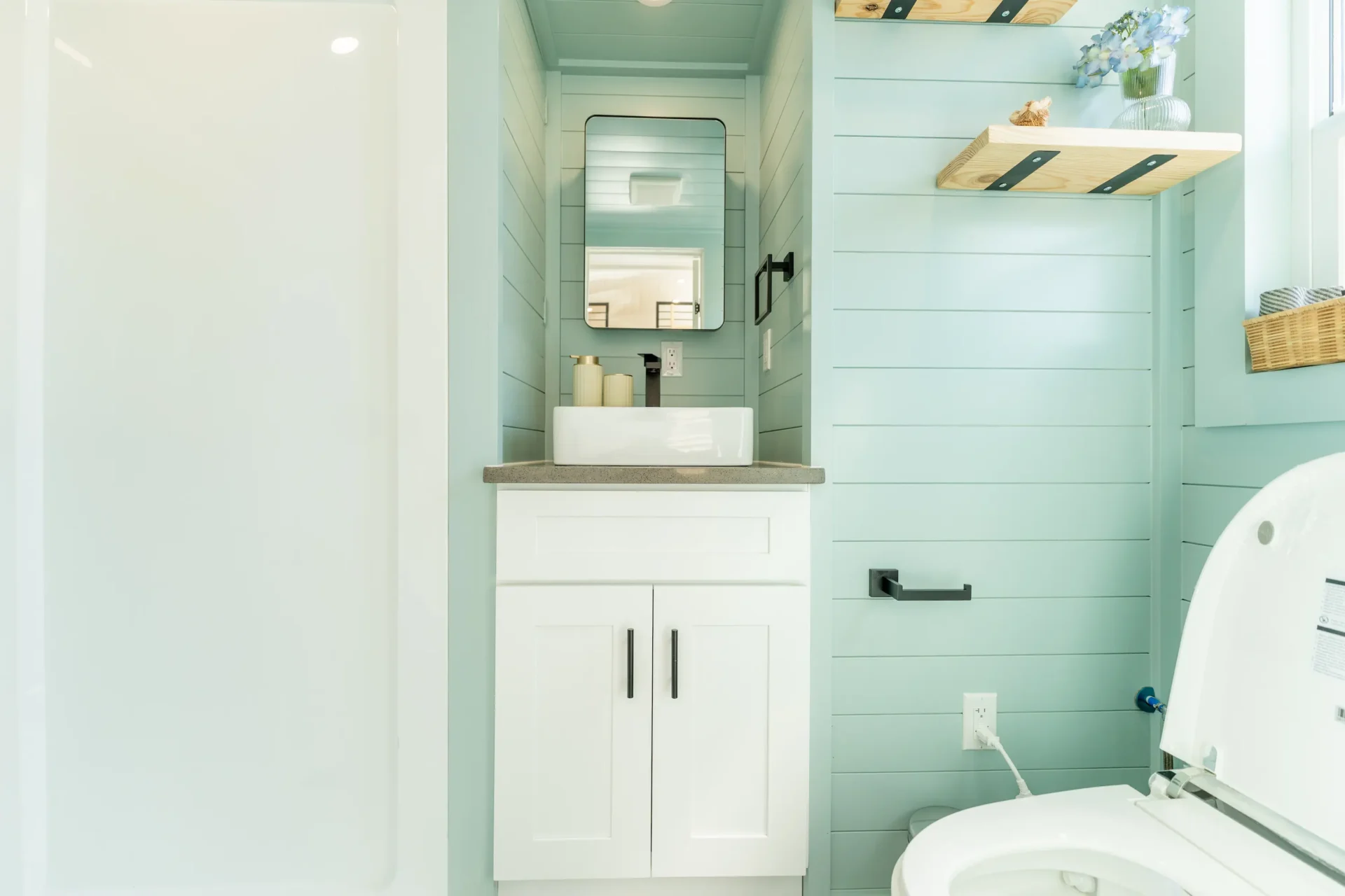 The bathroom features upgraded finishes including electric bidet toilet, black hardware, black medicine cabinet, and a custom accent paint color for a more modern feel.