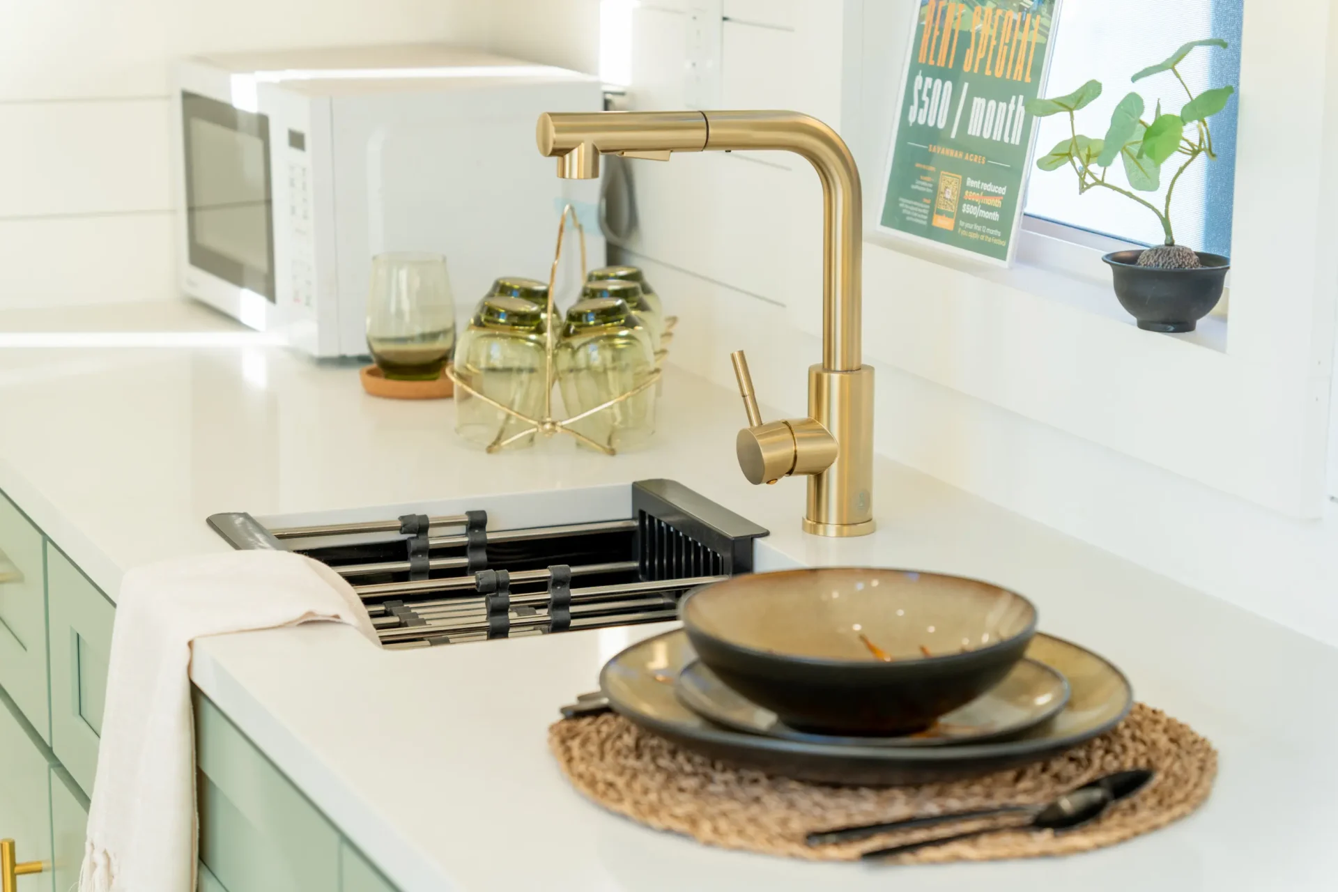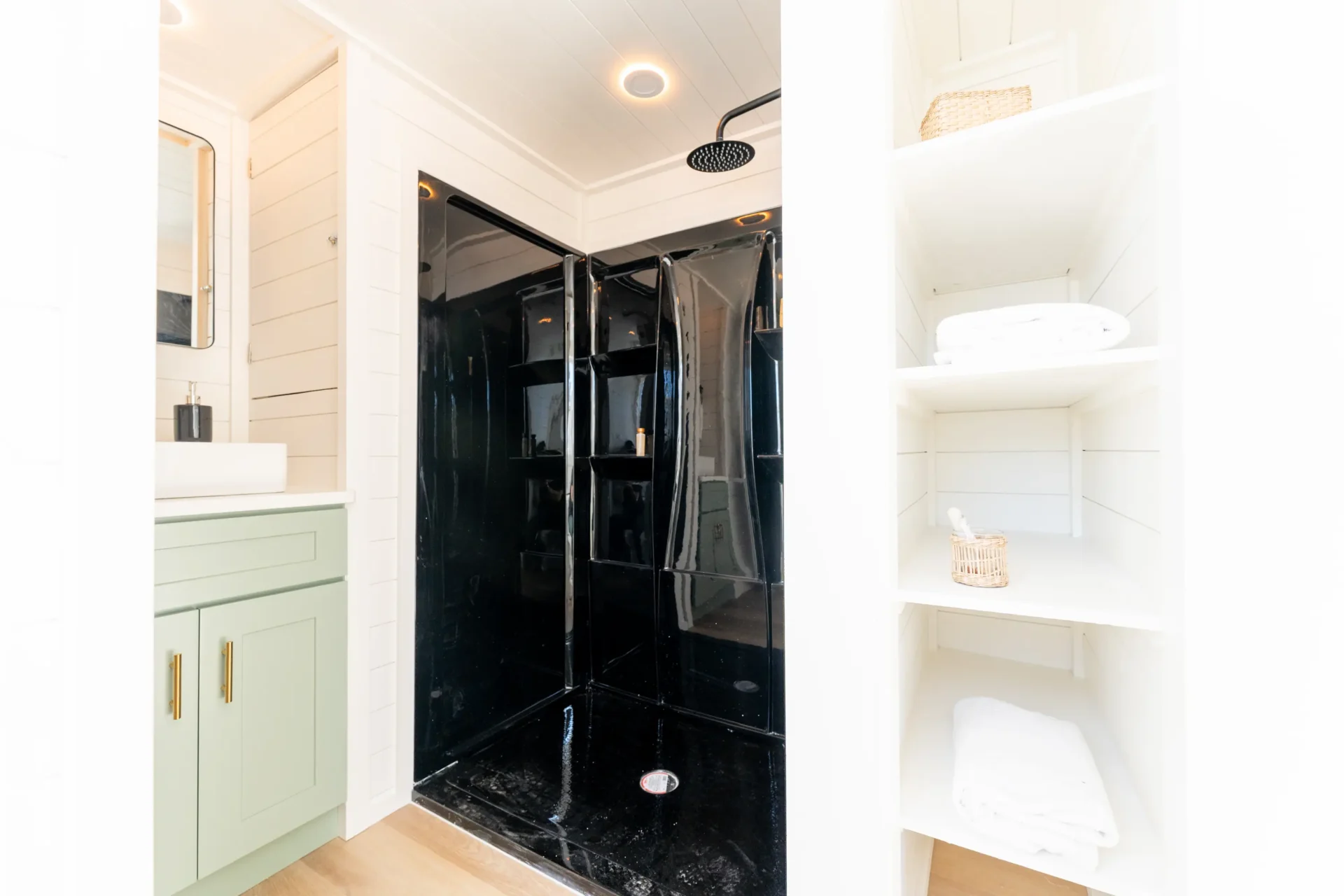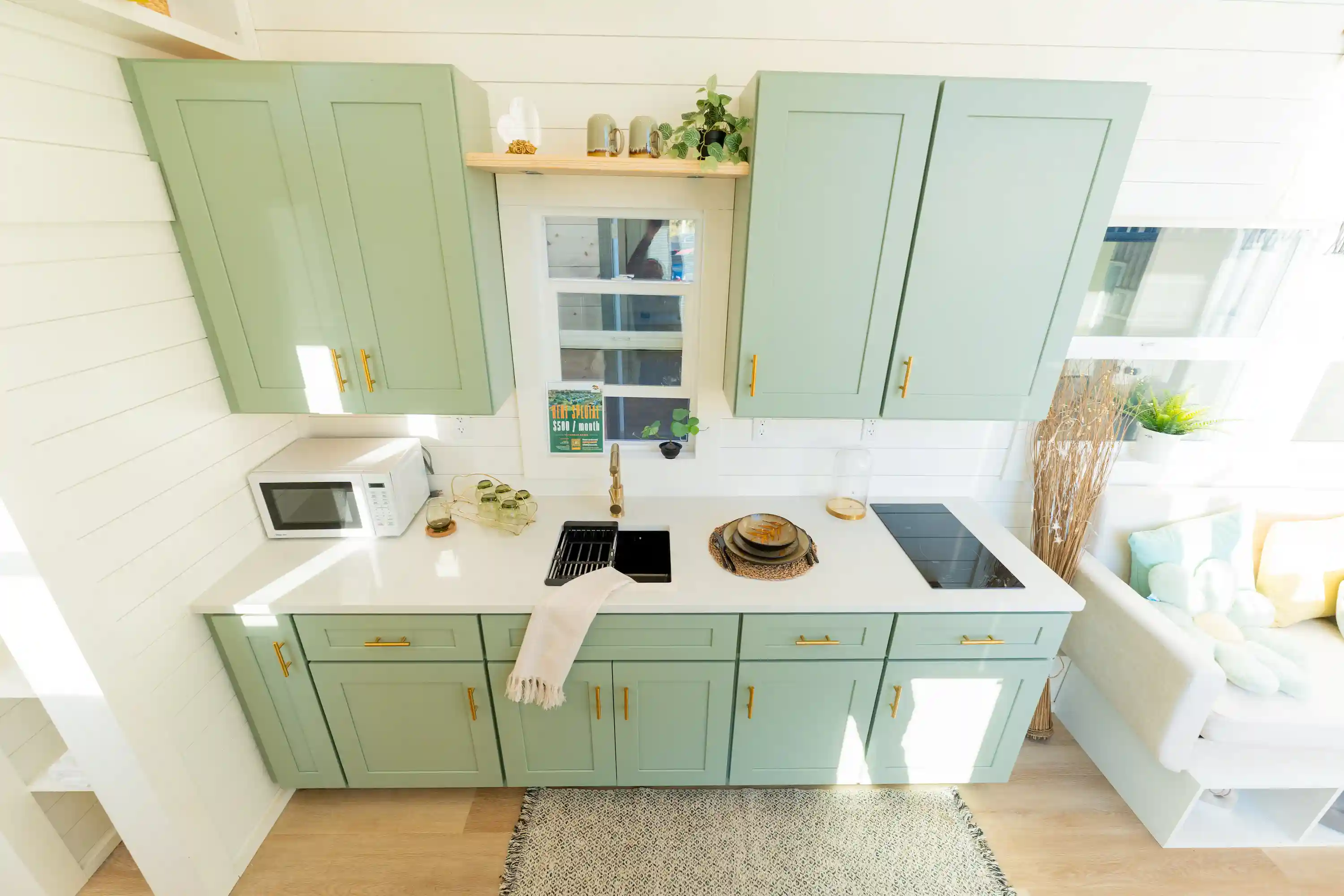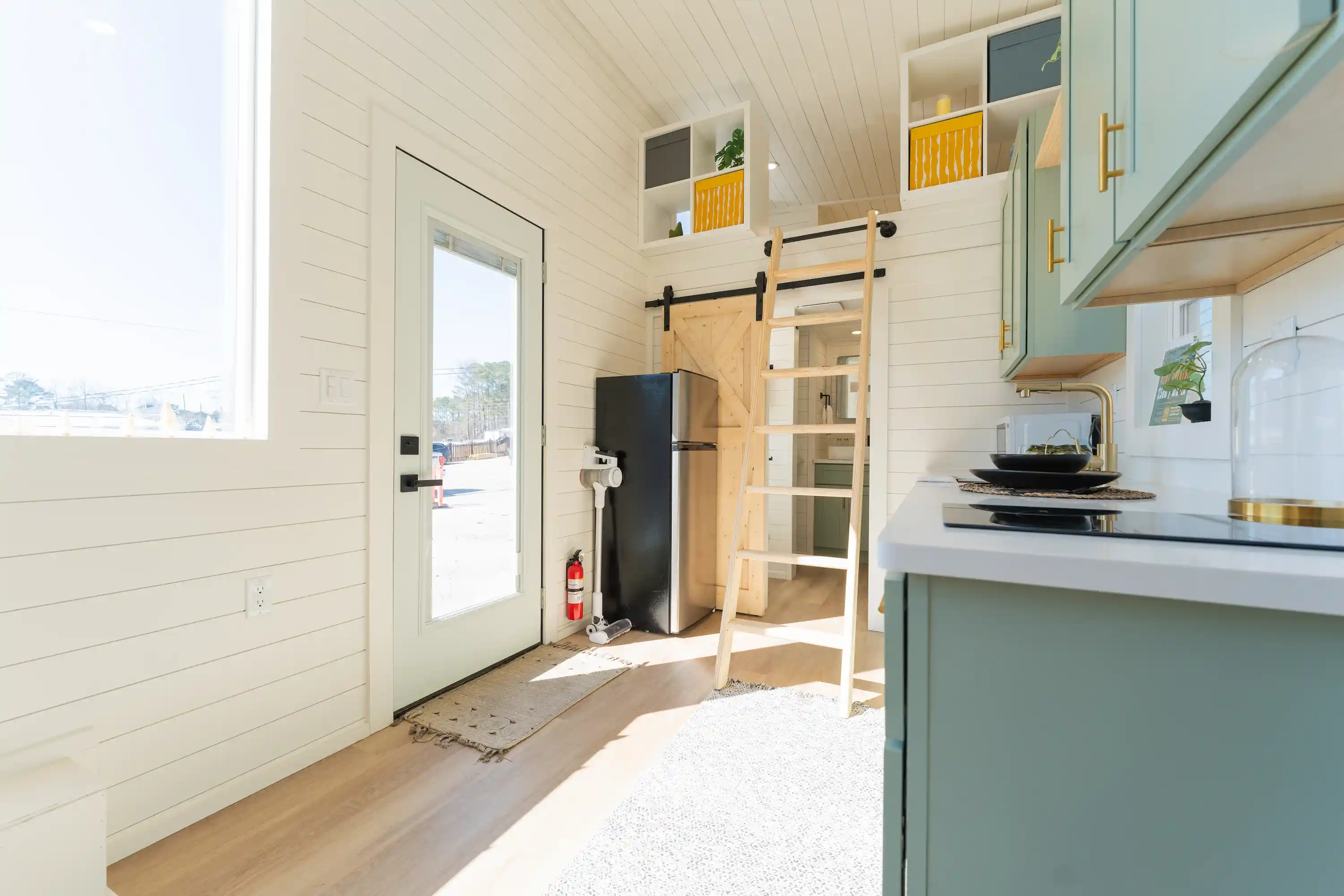 The kitchen is the largest we offer, with a two-burner induction cooktop, stainless steel sink, abundant countertop space, upper cabinets, and a shelf above the window. A standard 7-cubic-foot refrigerator fits easily, with room to upgrade if desired.