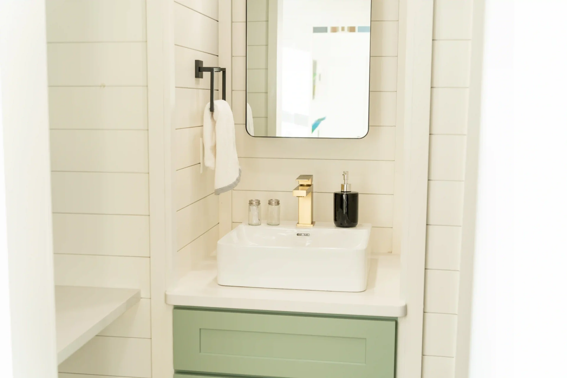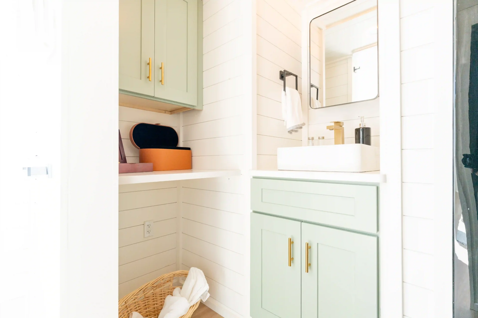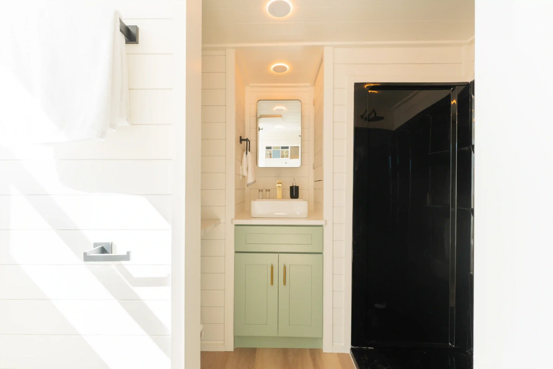 The bathroom is designed for a cozy, efficient experience. It features a 48-inch shower, a stylish barn door, a vanity with storage, a medicine cabinet, a flush toilet, and a combo washer and dryer setup for ultimate convenience. Every detail is crafted to make daily routines simple, comfortable, and organized.