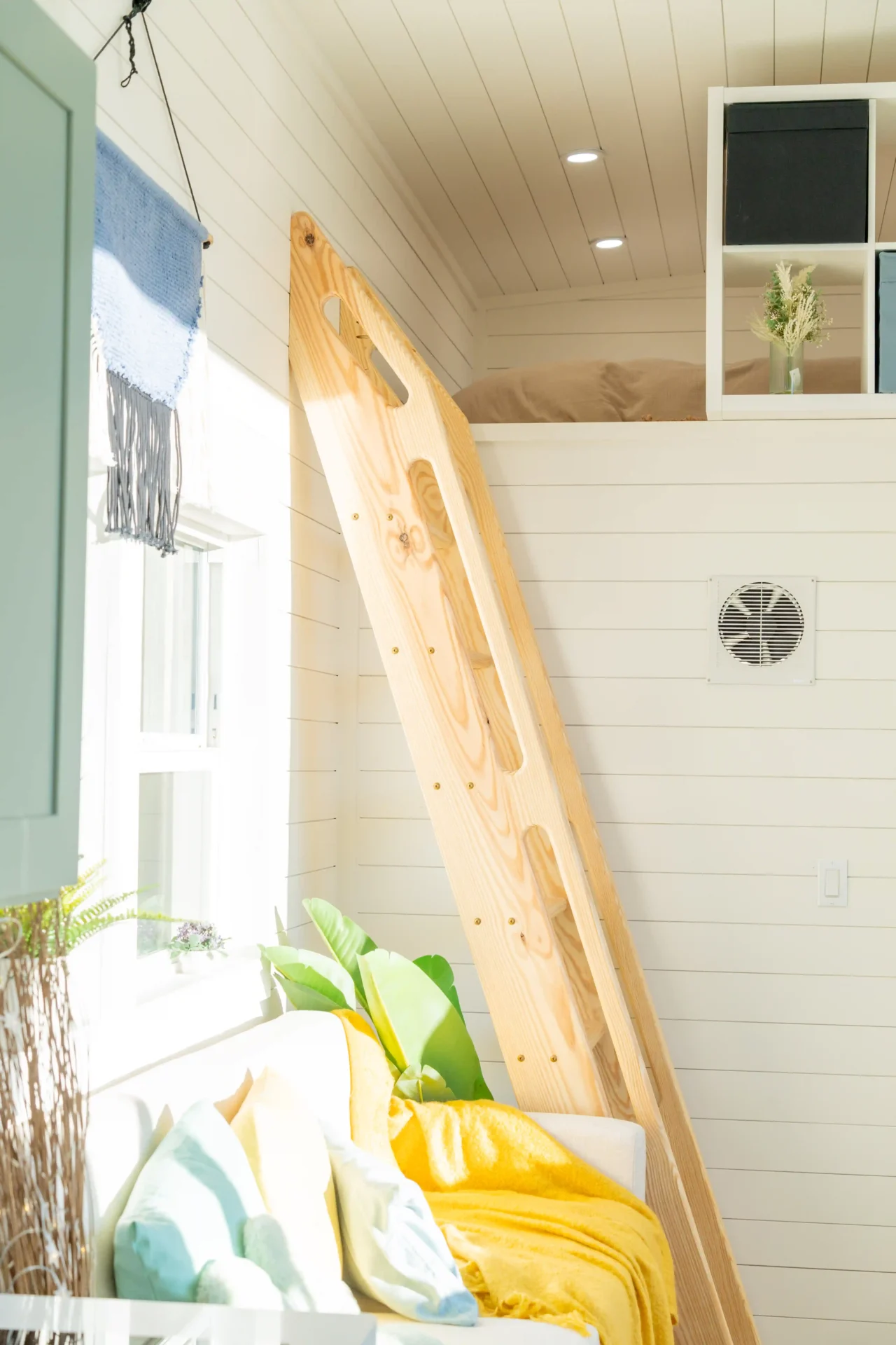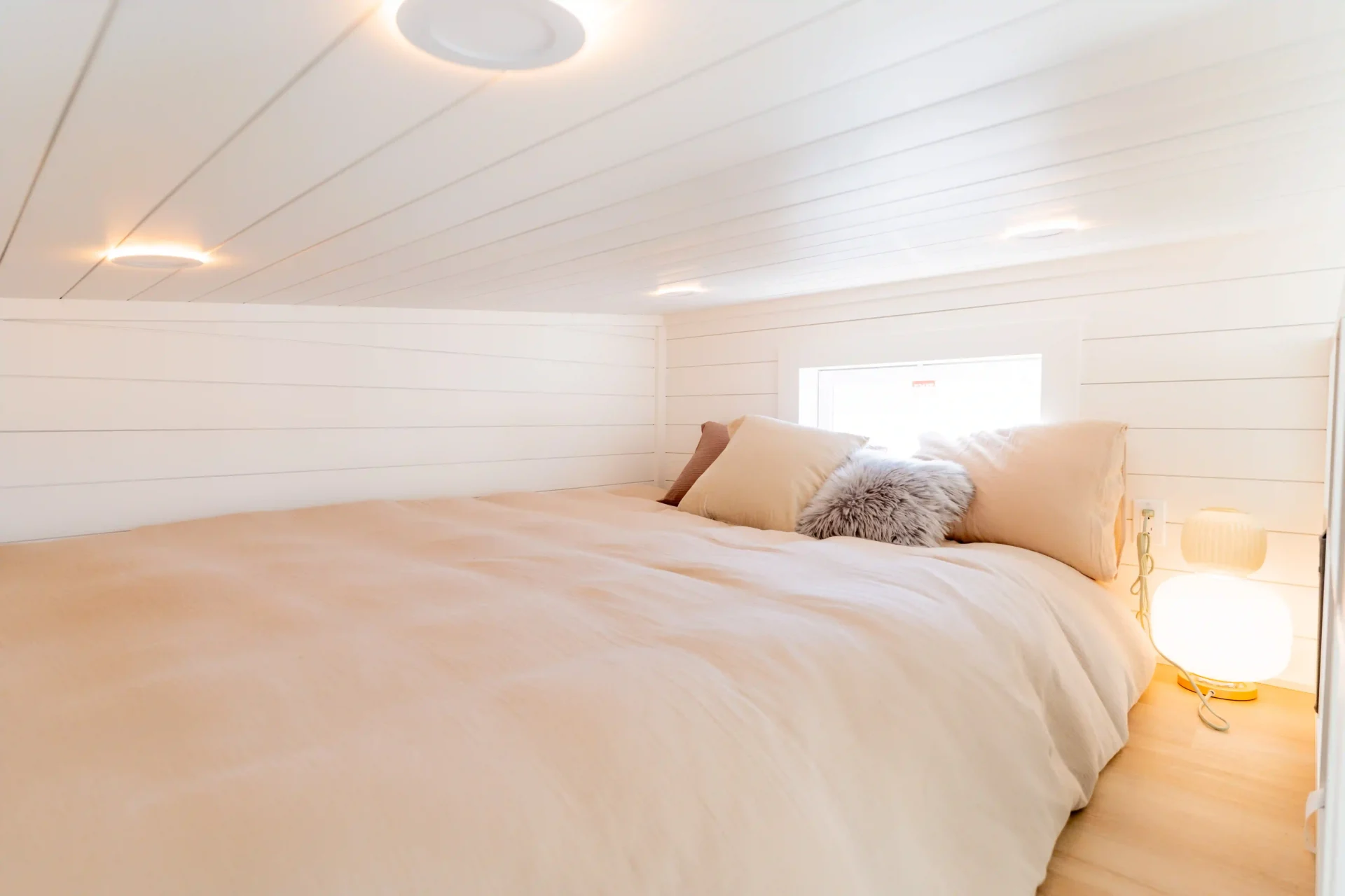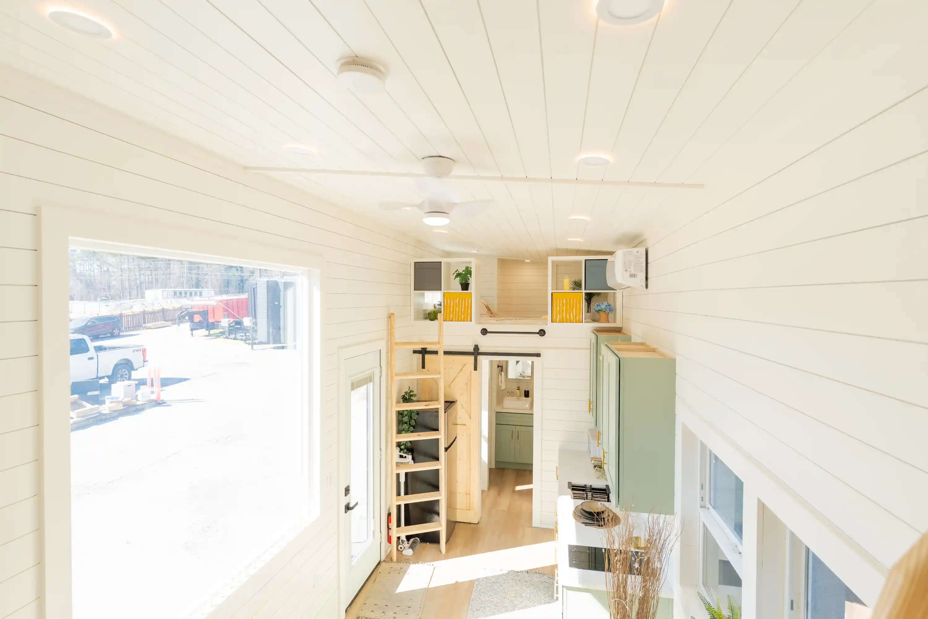 Above, there are two lofts, a primary queen and a bonus loft over the bathroom, adding extra sleeping or storage options and creating a home that is both cozy and highly functional.