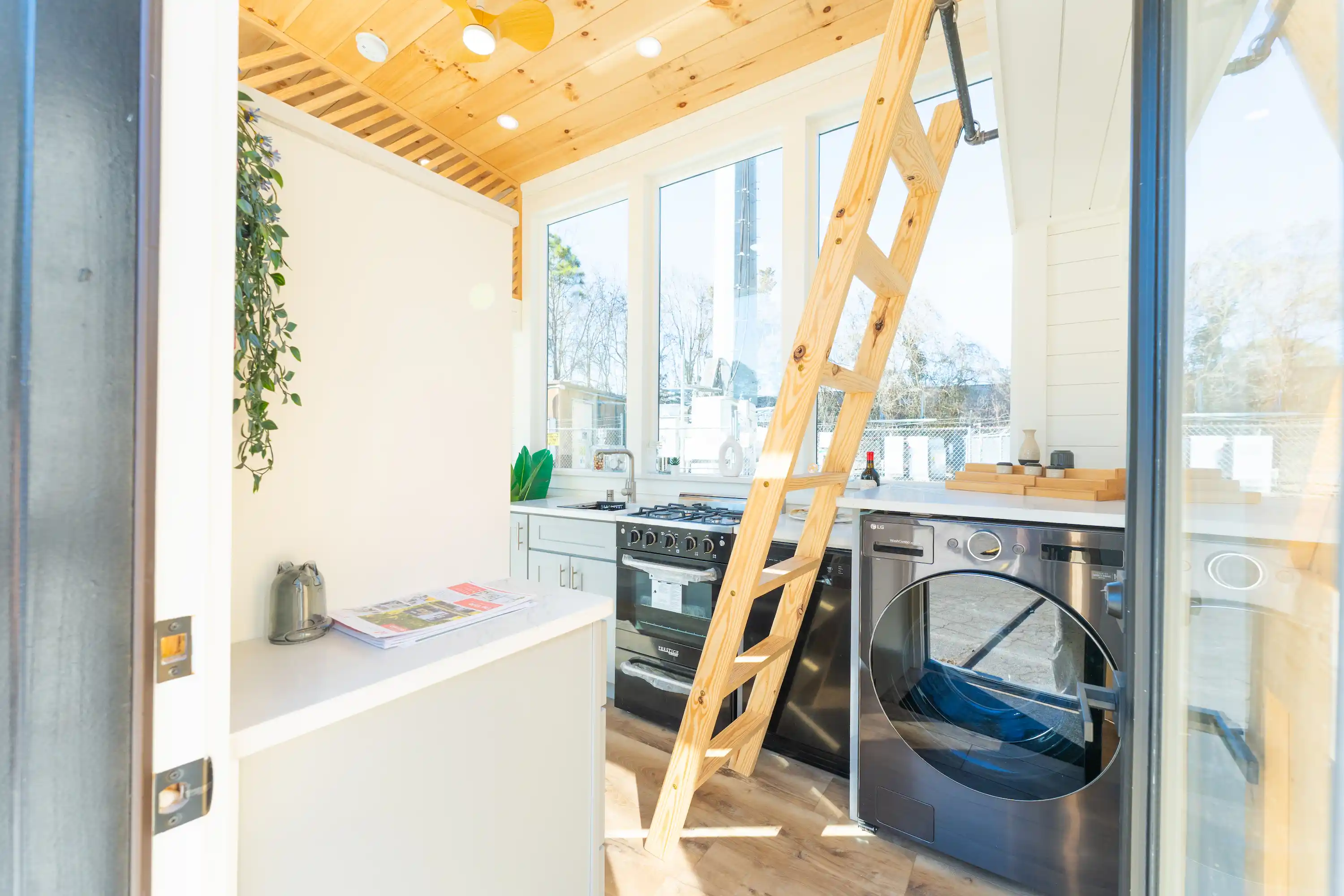 At 24’ long, 8’ 5” wide, and 13’ 5” high, this home provides 204 sq. ft. of living space, plus two lofts for extra storage or flexible sleeping areas. The lofts help maximize vertical space while keeping the main floor open and easy to move around in. One loft is located above the bathroom and laundry area, while the other is above the opposite end of the home for flexible use.
