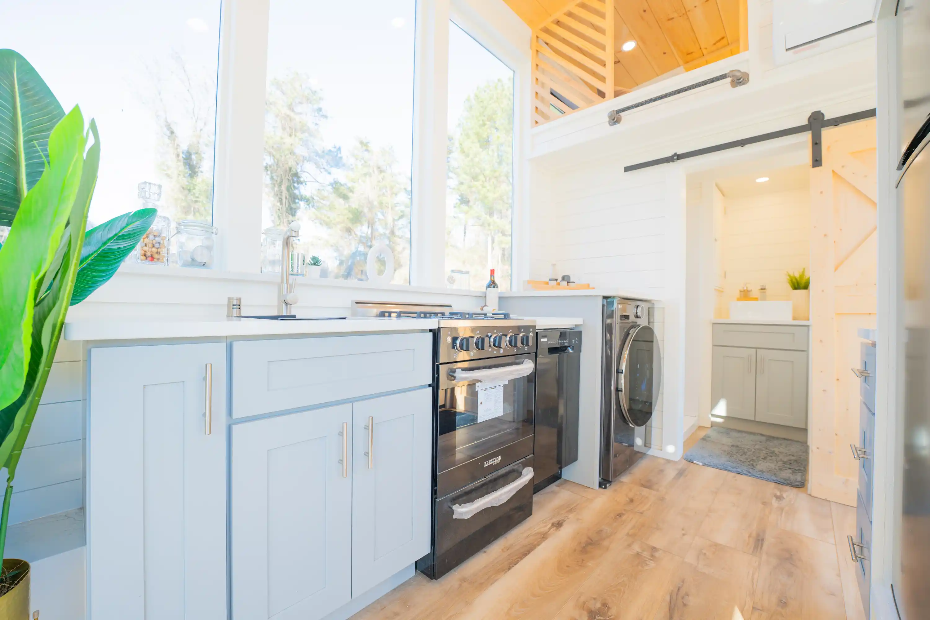 One of the most noticeable features is the large windows that let in plenty of sunlight, making the space feel bright and open while highlighting the warm Georgia pine finishes and elegant quartz-trimmed window sills. It’s a great choice for full-time living while still enjoying natural light and peaceful, scenic views, all within a smart, efficient layout.