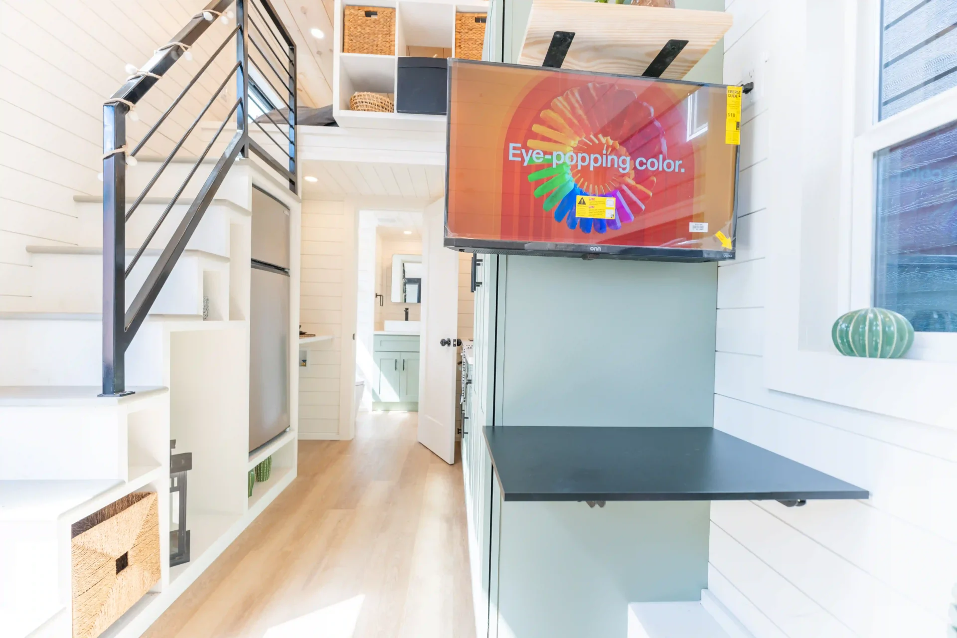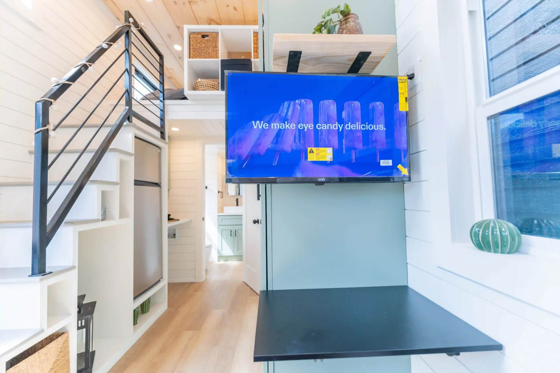 The living area comes furnished with a couch, mounted TV, and ceiling fan. Dual-pane windows bring in natural light, making the space feel bright and inviting while the queen loft upstairs includes added cubby storage so you have room for essentials without clutter.
