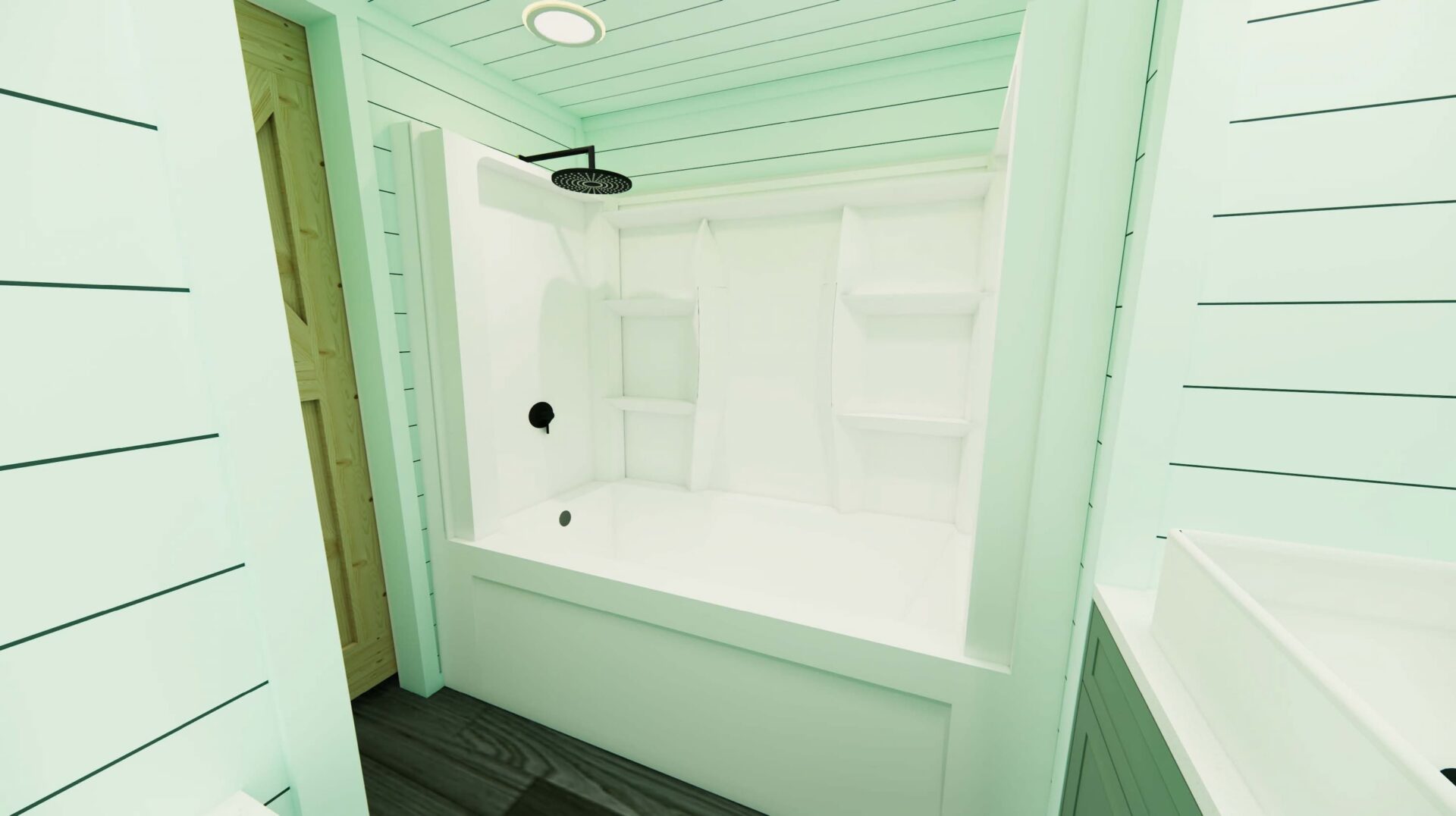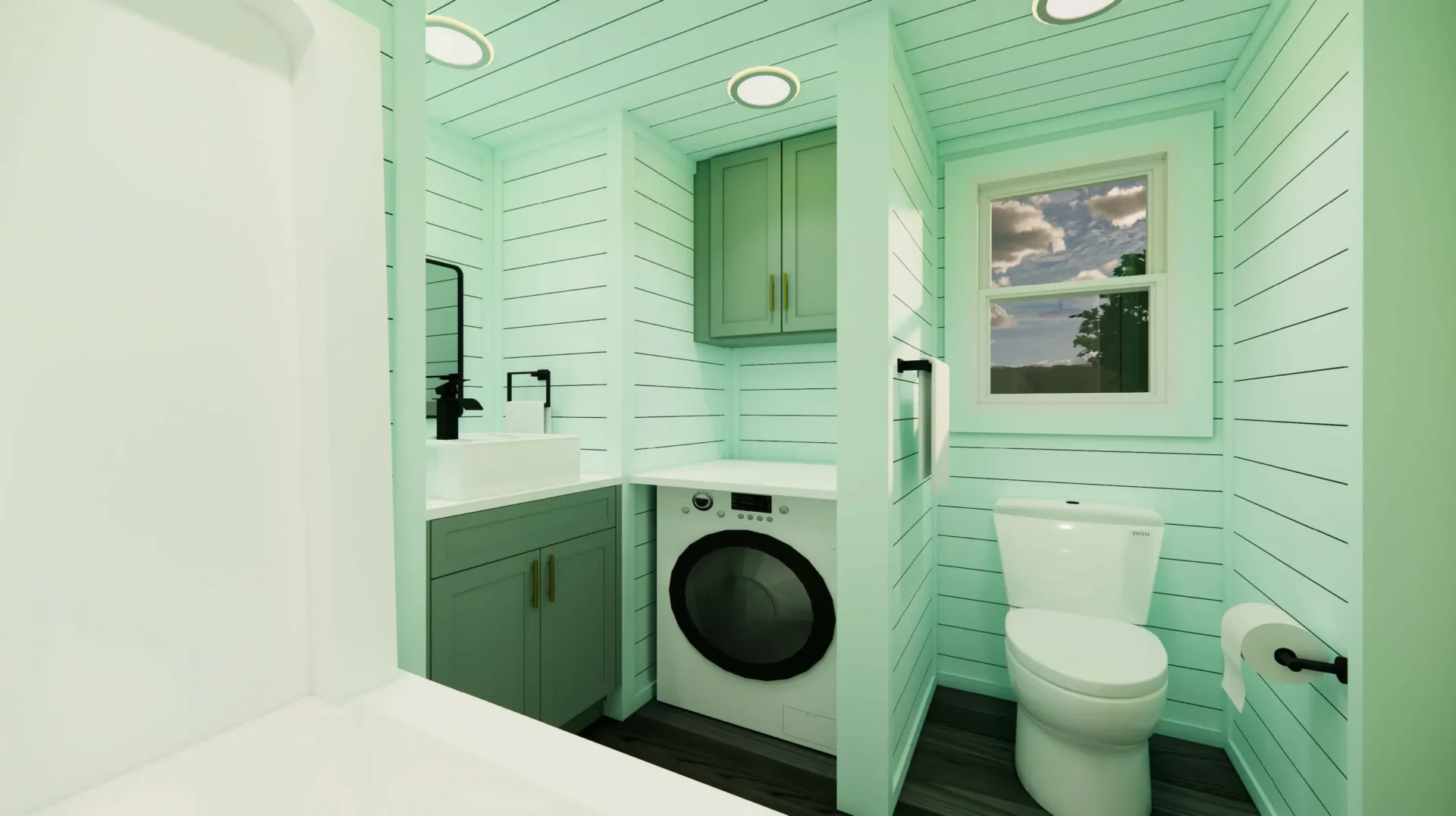 The bathroom is one of the standout features in this design. With a full bathtub, separate shower, private toilet room, and dedicated laundry area, it brings the kind of comfort and function you would expect in a traditional home and that is not something you find often in a tiny