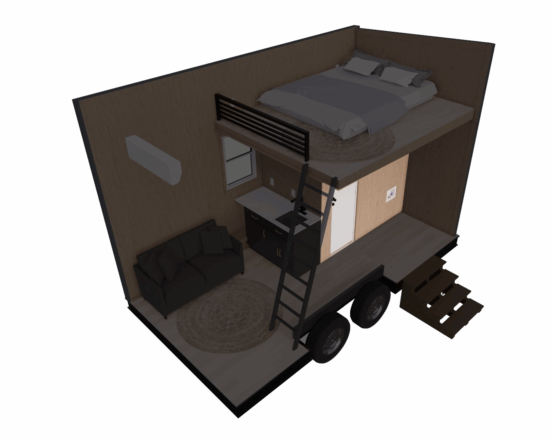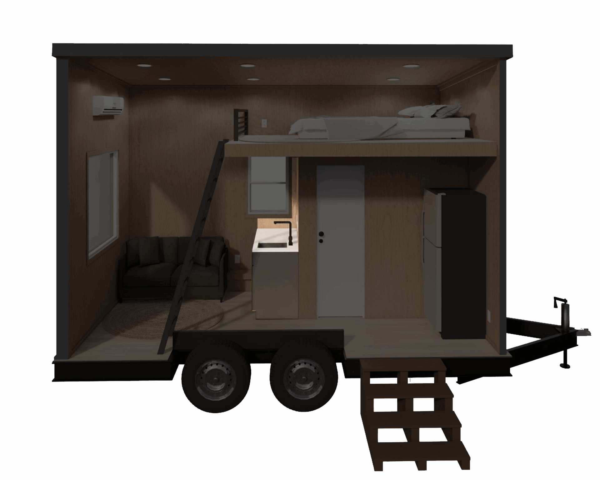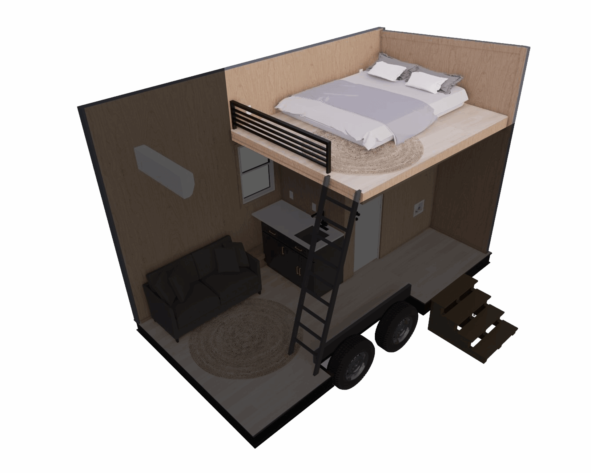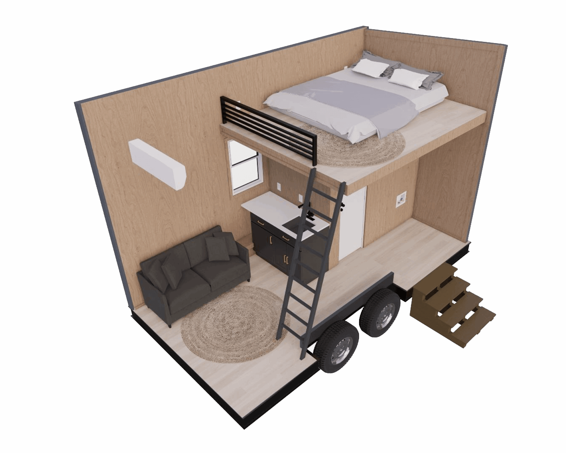 Element 16 is a no-frills tiny home built for affordability, quick delivery, and everyday use. It’s a practical choice for buyers looking for a simpler path to homeownership, for giving a loved one more independence, or for adding flexible space to a property. The layout includes a sleeping loft, full bathroom, and light kitchen setup—everything you need in a compact, towable build.